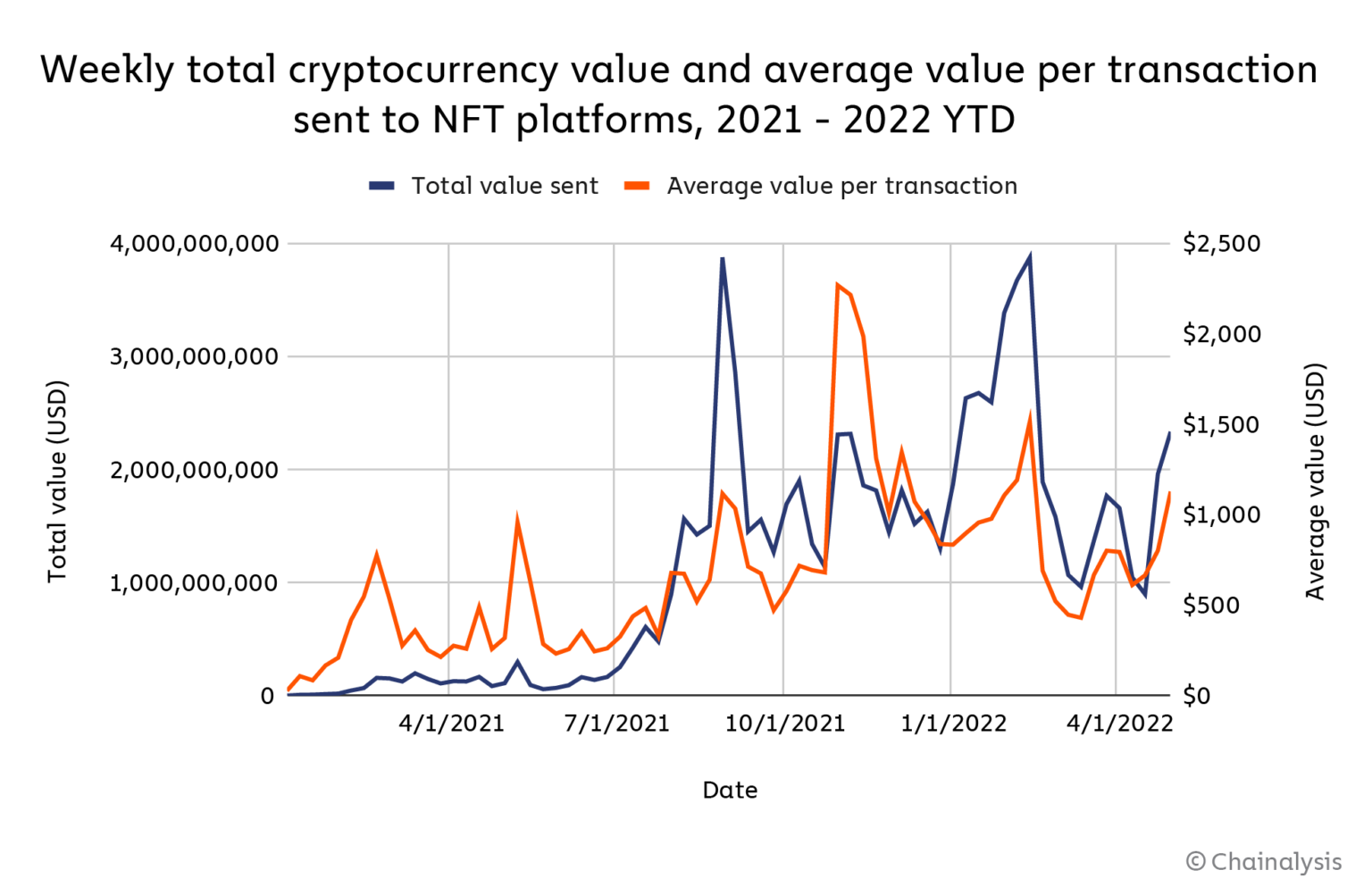报告概述了 NFT 交易量零星出现,自 2 月中旬以来一直处于低迷状态。自 4 月中旬以来,NFT 市场出现了短暂的复苏——很可能是由于最近围绕 Moonbirds 和 Bored Ape Yacht Club 的 Metaverse 项目 Otherside 的炒作。