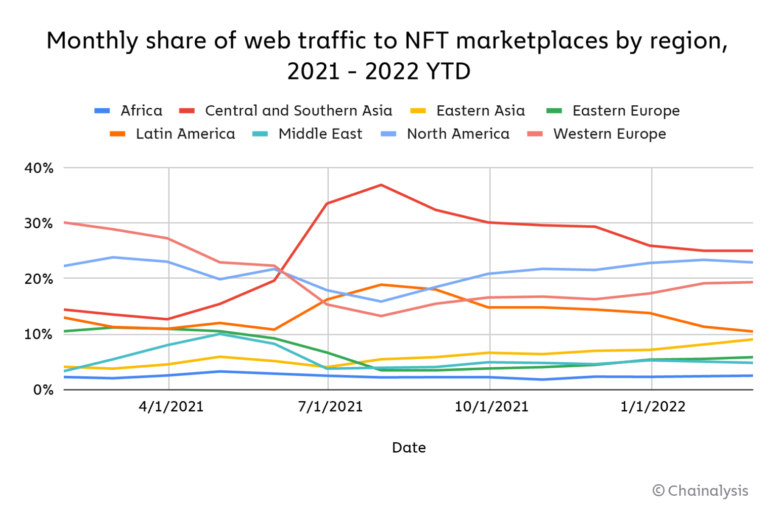 通过分析主要 NFT 市场的网络流量,Chainalysis 确定 NFT 吸引了来自全球各个角落的用户,其中 Central南亚领先,紧随其后的是北美和西欧。